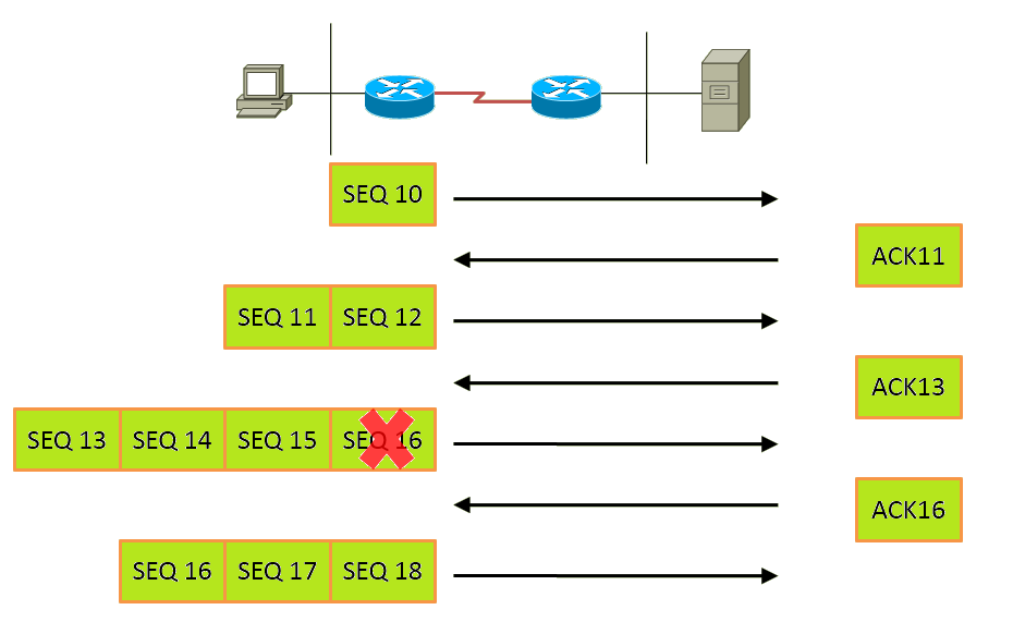 Ukázka komunikace pomocí TCP (16. packet se při přenosu ztratil a je poslán znovu):